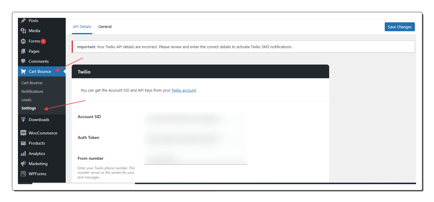 After activating the plugin, go to Cart Bounce -> settings -> API Details in the WordPress admin menu.
