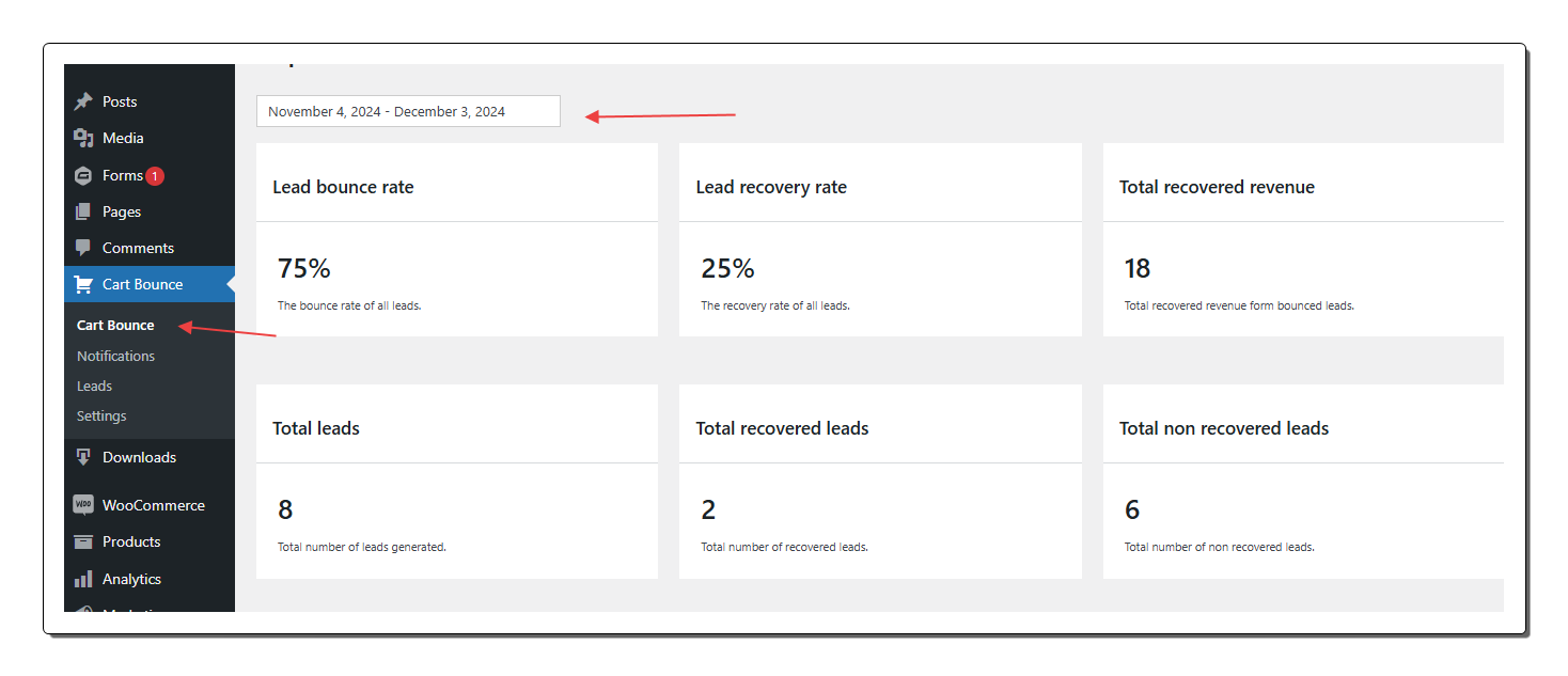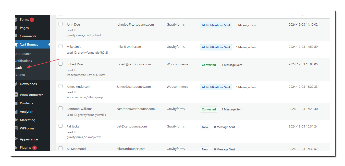 To see all the leads captured, you can go to Cart Bounce > Leads