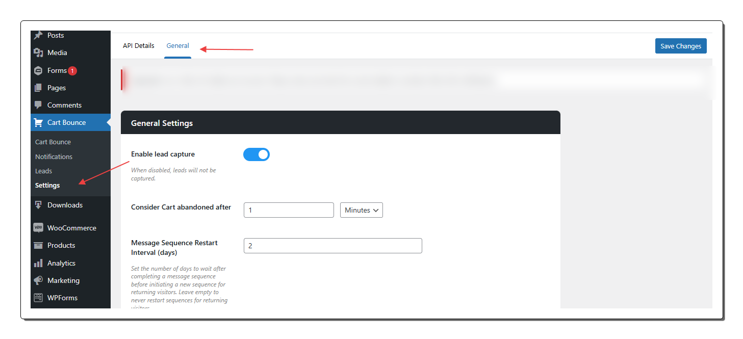 To configure general settings for Cart Bounce, go to Cart Bounce > Settings > General Settings in the WordPress admin menu.