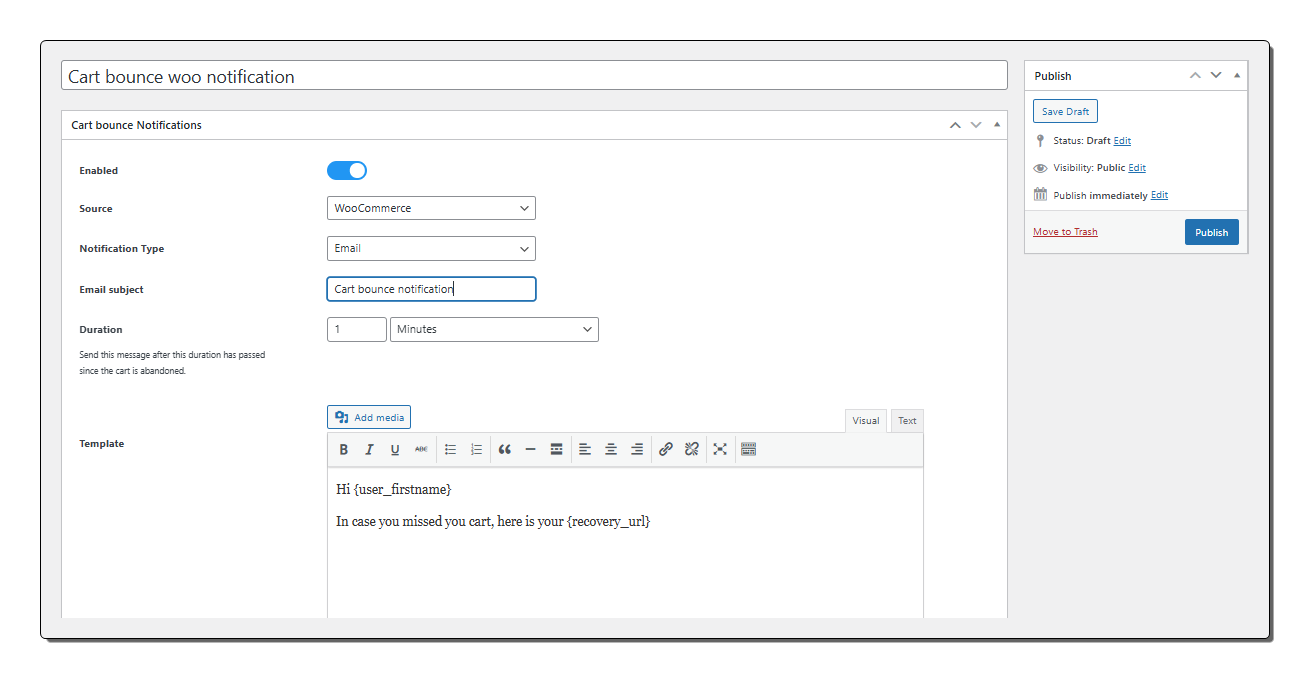 - Go to Cart Bounce -> Notifications -> Add new Notification.