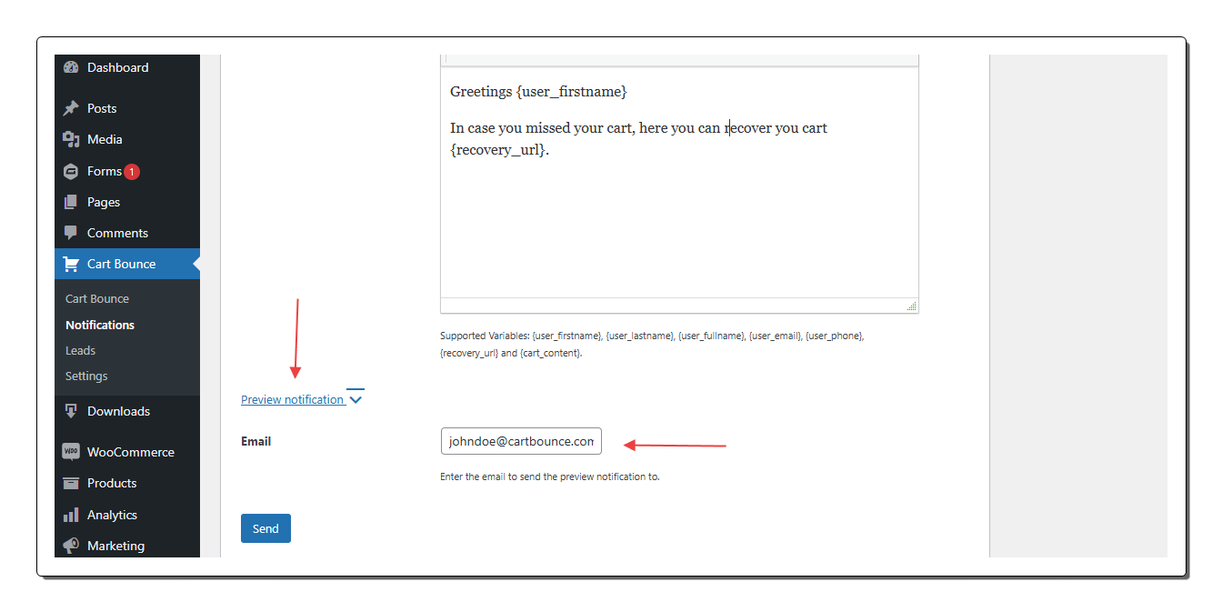 Cart Bounce facilitates the admin to send preview notifications to themselves, before sending actual notifications. To send a preview notification, please follow the below steps: