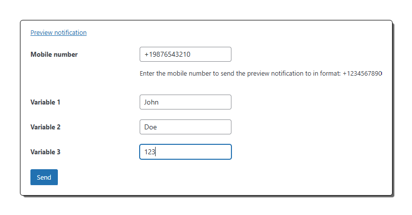 - Add the email address or mobile number with all mandatory fields to send the notification preview.
