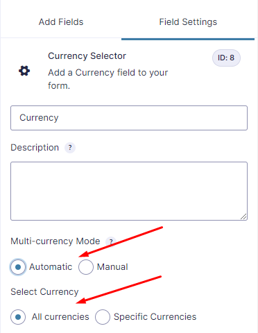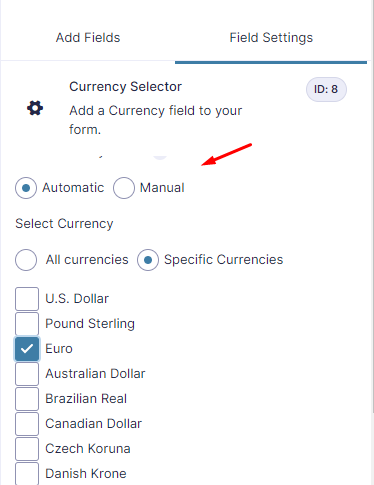 Multi-currency Mode: If you want the currency conversion to be done automatically through Openexchangerates.org‘s API, then choose Automatic. In Automatic mode, you only set the price of product in the form’s base currency. And all the other currency rates will the determined from the Openexchangerates.org‘s API.
