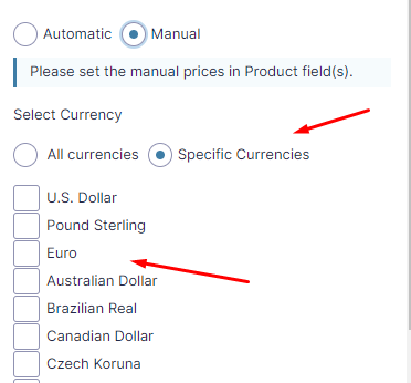 If you want to manually set the price of each product, then choose the manual mode. After choosing manual mode, you will need to go to the each product and set prices in each currencies.