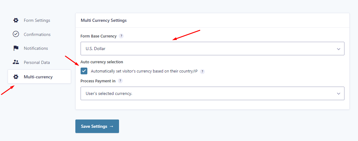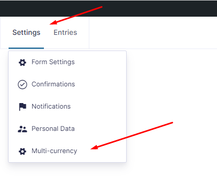 To access the form settings, Go to any form > Settings > Multi-currency