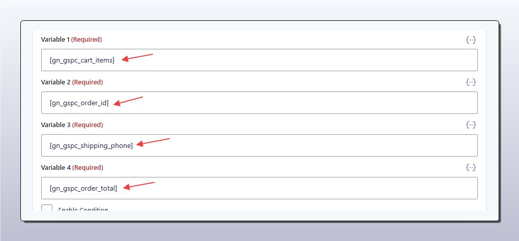 - If your WhatsApp template includes variables, they will appear below the message field. You can select or enter any value to replace in the template; this can be a field value or a custom value. Additionally, you can use the following shortcodes: