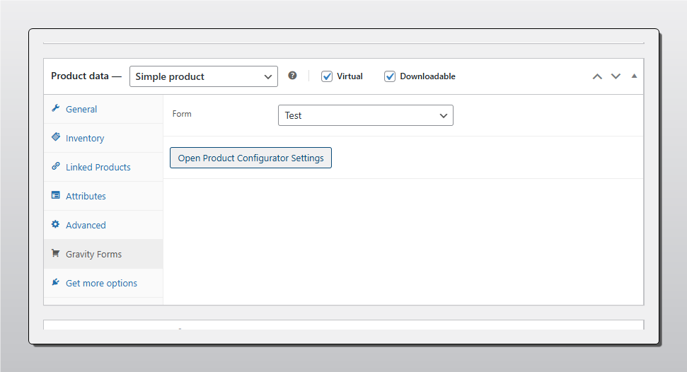- Scroll down to the Product data meta box, and click on Gravity Form tab.