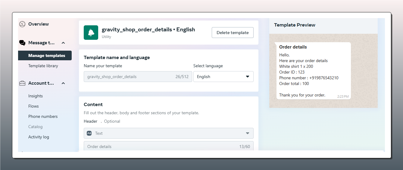 Utilityas the template type and add header details like header title and template type ( text, document or media). - Add the content of your template in the Body section.