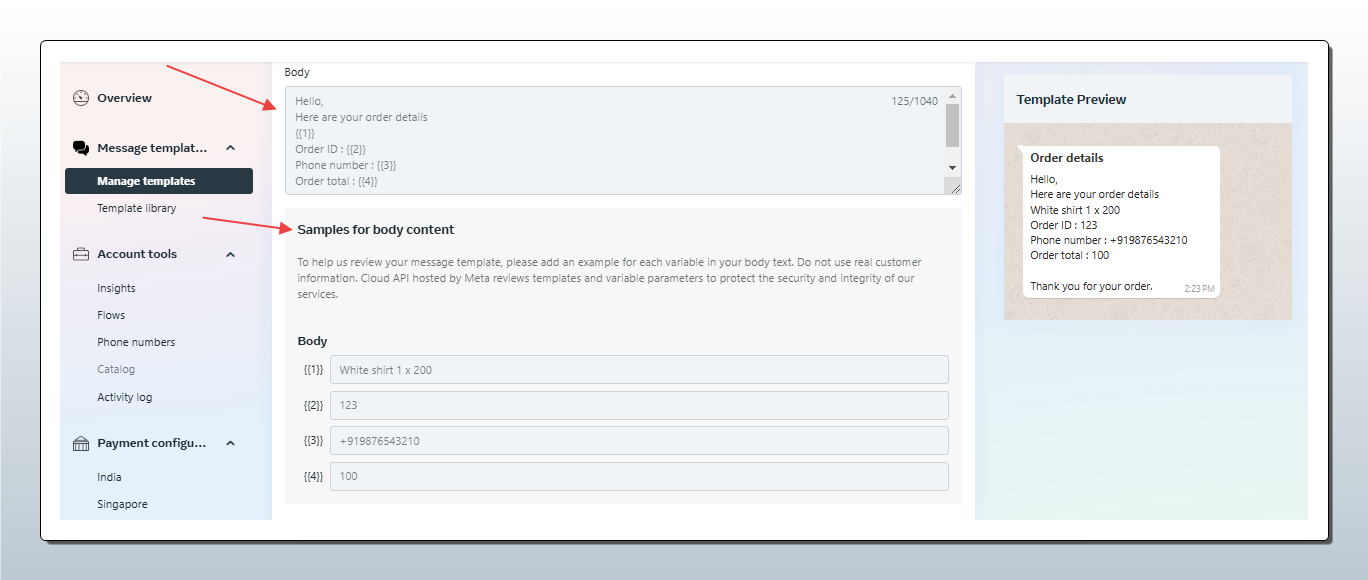 Important: In Samples for body content section, try to add realistic placeholders, using unrealistic sample values may lead to your template being marked as unapproved by WhatsApp.
