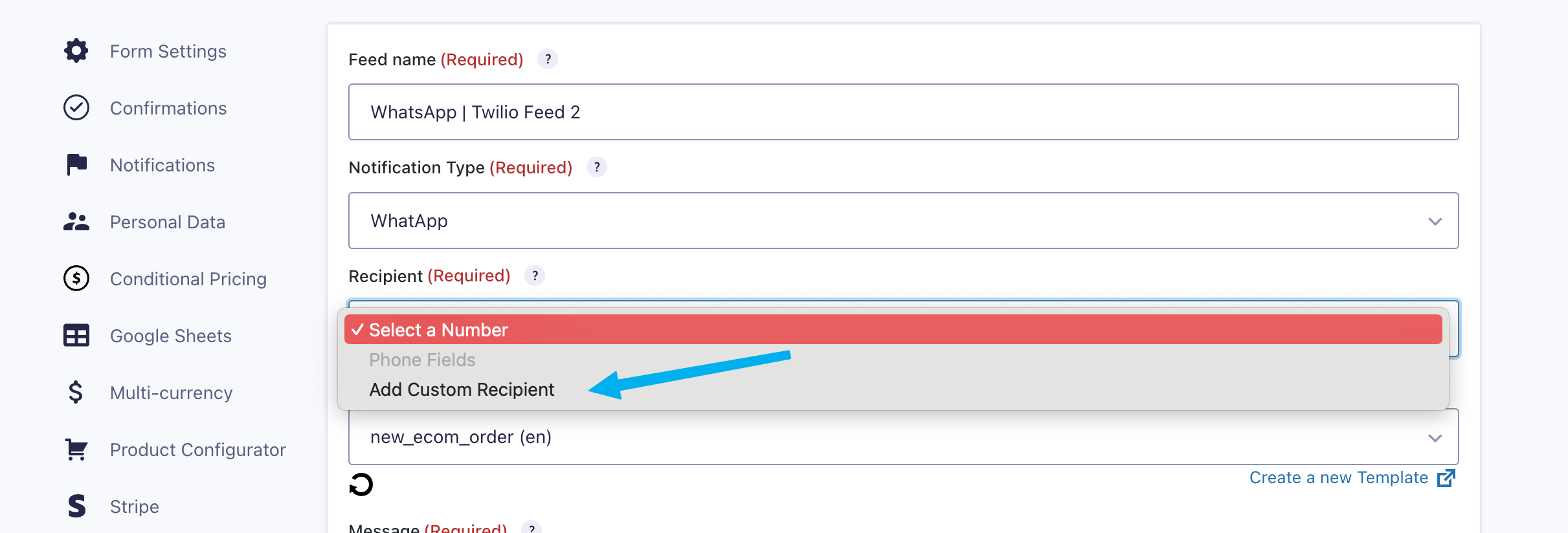 - If you want to send the notifications to the customer’s billing or shipping number entered when placing the order at WooCommerce checkout, select Add Custom Recipient and add one of these shortcode: