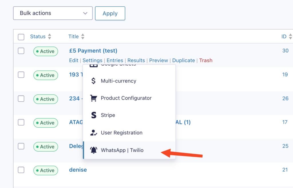 - Hover on the Settings button and click on WhatsApp | Twilio.