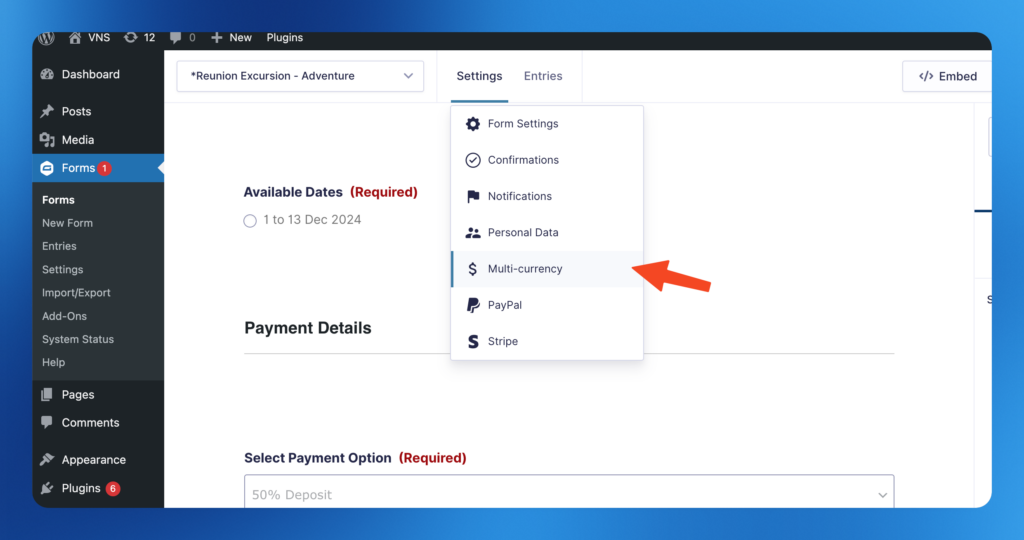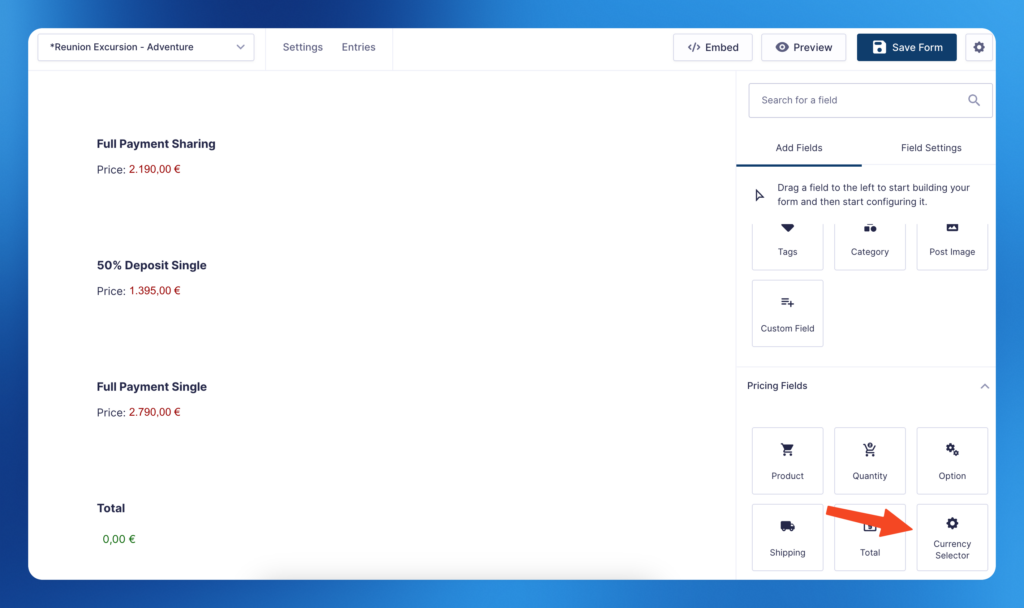 4. Go to the Form editor and add the currency switcher field