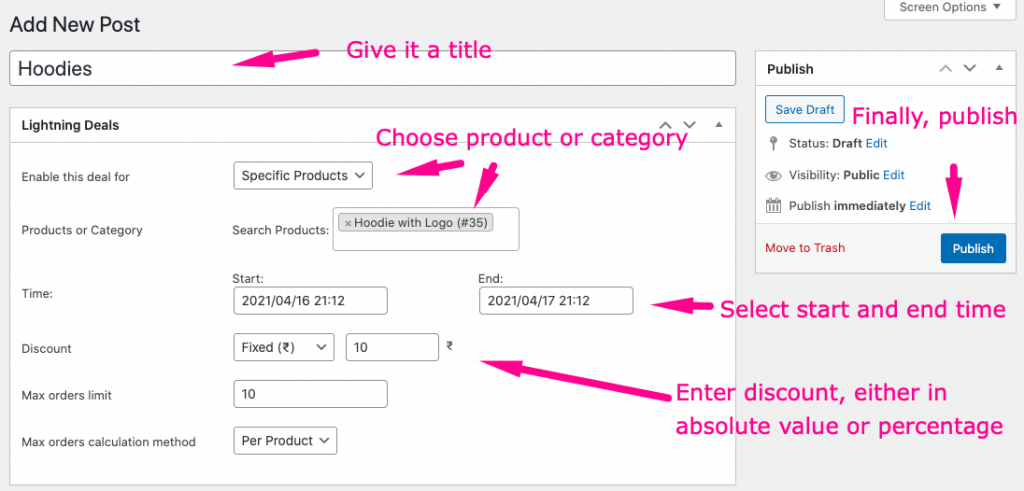 - Enter Max order limit. Deal will end after this number of products have been sold.